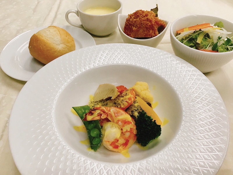・スープ・シーフード香草焼き・ポークヒレカツ・サラダ
