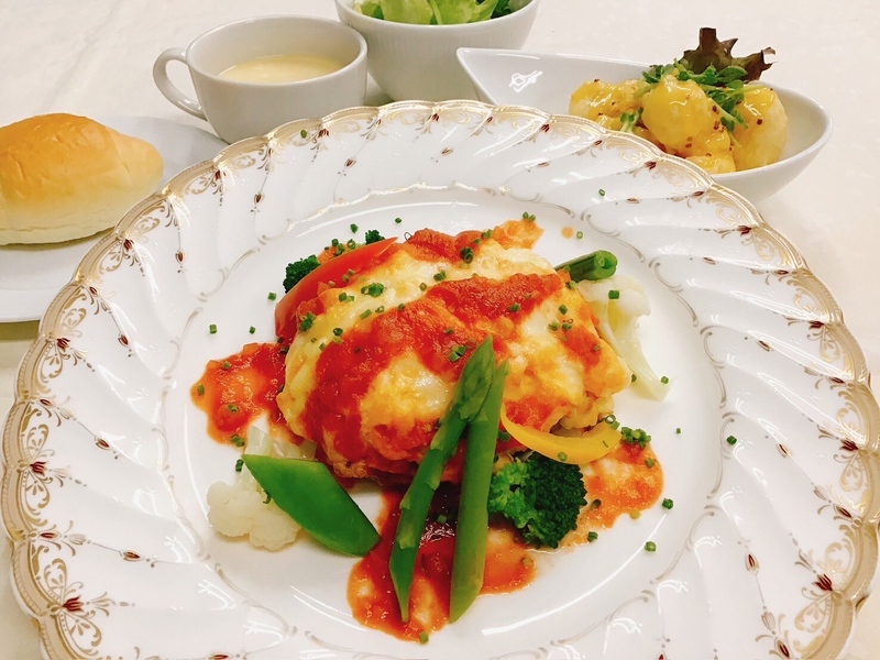 ・スープ・チーズエッグハンバーグ・シーフードフリッター・サラダ