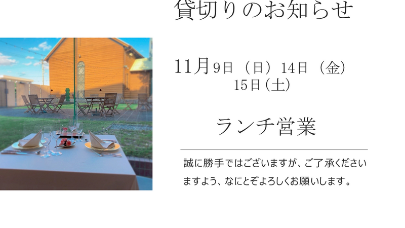誠に勝手ながら11/9(日)と11/14(金)、11/15(土)のランチ営業は、予約貸切りの為