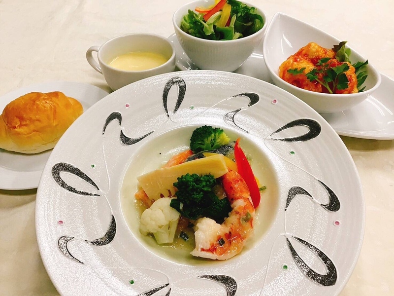 ・スープ・シーフードポワレ梅ネギ塩ソース・チキンフリッター